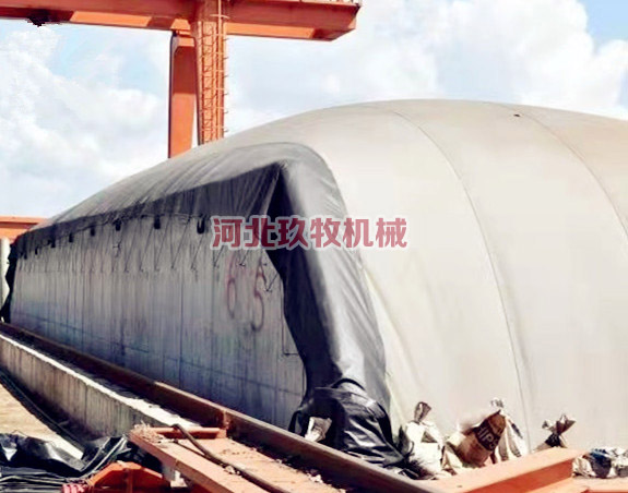 纳米模式发酵是一种新的堆肥发酵技术系统,可以实现废弃物资源化利用,用于发酵鸡粪、牛粪、猪粪、羊粪等禽畜粪便、秸秆、尾菜、污泥等,处理有机固体废弃物的静态堆肥好氧发酵技术,在运行过程中免翻堆能够节省很大的人工和耗能,通过膜覆盖之后,底部的曝气能给堆体内微生物提供足够的发酵所需的氧气,随着温度的上升,氨气、硫化氢等臭气的大分子外溢,纳米膜的微孔结构能够阻挡外面的水分进入,能够阻止堆肥过程中产生的水滴、病原菌、灰尘以及臭气等大分子物质透过,避免了其他系统粪便堆肥产生的空气污染但是能够将小分子的水分子穿过去,同时氨气、硫化氢大分子不能通过,溶于膜表面的水蒸气最后返回到堆体再被微生物所利用,这样就达到了既除去水分,又没有臭味的效果。